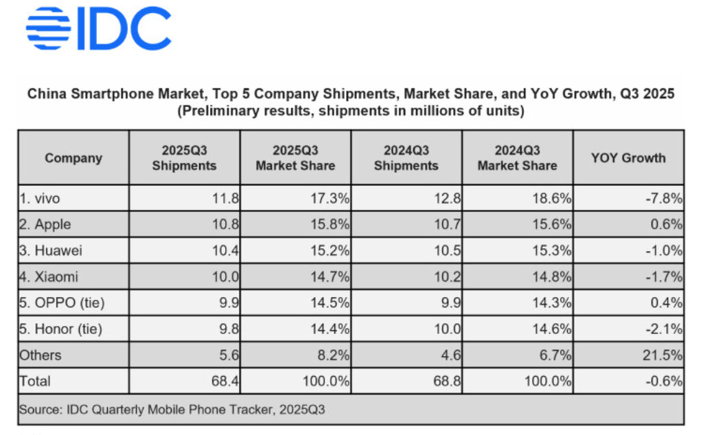 Trzeci kwartał roku przyniósł nieznaczny spadek na rynku smartfonów w Chinach. Według danych opublikowanych przez IDC na III kwartał 2025 r.Łączna sprzedaż osiągnęła 68,46 mln sztuk, co stanowi spadek o 0,5% w porównaniu z analogicznym okresem ubiegłego roku. To niewielki, ale znaczący spadek, odzwierciedlający tradycyjnie słabszy okres sprzedaży, pogłębiony w tym roku przez mniejszą liczbę premier nowych produktów i ograniczenie rządowych dotacji do zakupu urządzeń mobilnych.