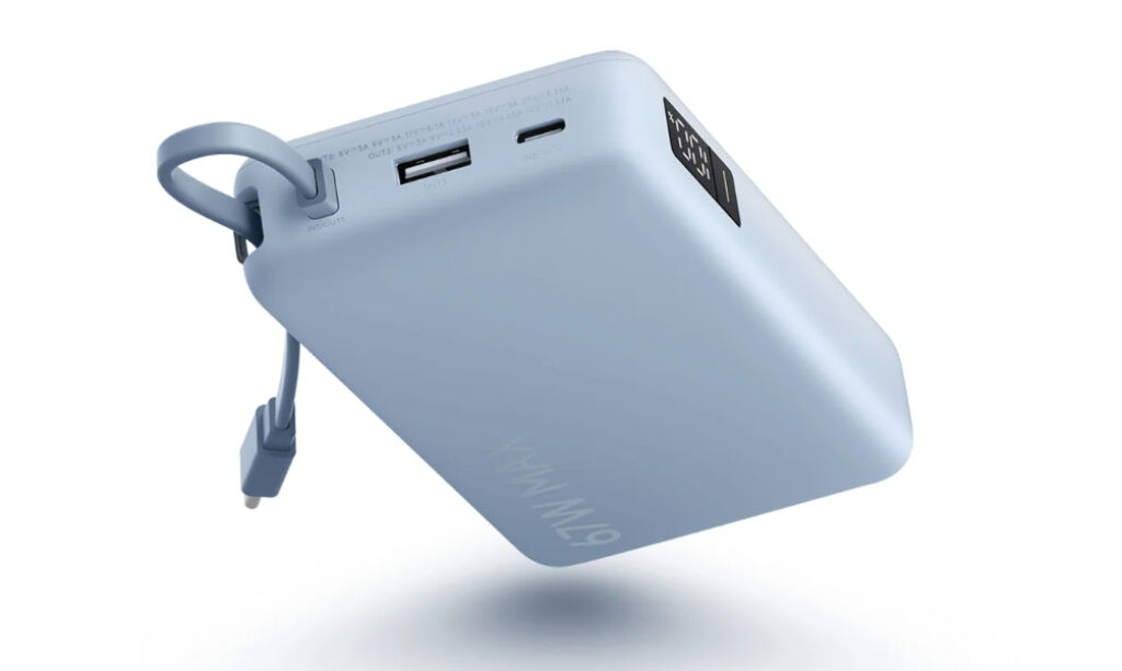 Powerbank obsługuje szybkie ładowanie do 67 W przez USB-C, zgodne z protokołami PD 3.0, PPS i QC 3.5. Oprócz zintegrowanego kabla, posiada port USB-A i drugi port USB-C, co pozwala na jednoczesne ładowanie do trzech urządzeń. Gdy wszystkie porty są zajęte, całkowita moc spada do 15 W, co nadal wystarcza do zasilania akcesoriów takich jak smartwatche, słuchawki i inne urządzenia o niskim poborze mocy.
